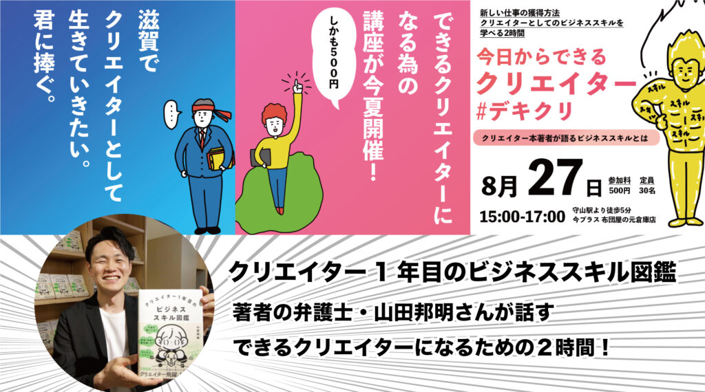 これらを網羅した「クリエイター1年目のビジネススキル図鑑」の著者の山田さんがなんと今回滋賀県で「滋賀のクリエイターをもっとサポートしたい!発掘したい!」という想いで開催されることになりました。